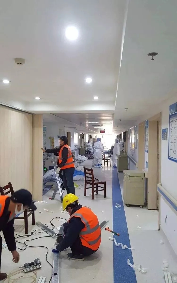 ? ? ? 2月17日下午,在舊樓住院部其余樓層完成消毒之后,項目人員再次緊急前往醫(yī)院,進行第二階段的施工,項目人員連軸轉(zhuǎn)直至第二天清晨。2月18日上午,為了嚴格貫徹上級“寧可讓床等人,也不要讓人等床”的指示,院方?jīng)Q定再新增一棟樓作為備用,在方案確定之后,公司積極響應(yīng),同步啟動第三階段施工,由于時間緊、任務(wù)重,公司從其他收尾項目抽調(diào)了10余名管理人員,60多名工人進行人員補充,確保了新樓舊樓同步施工。