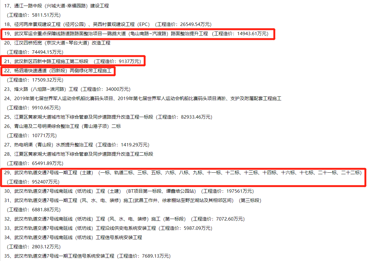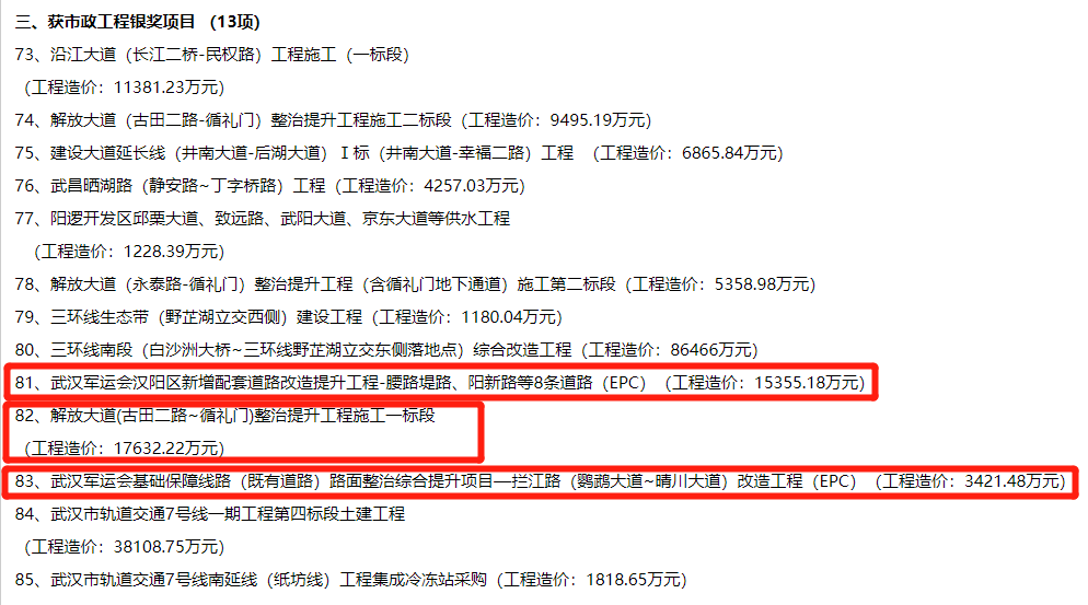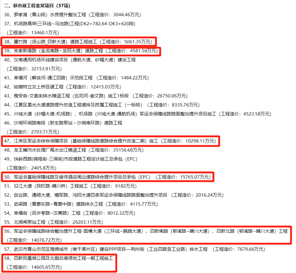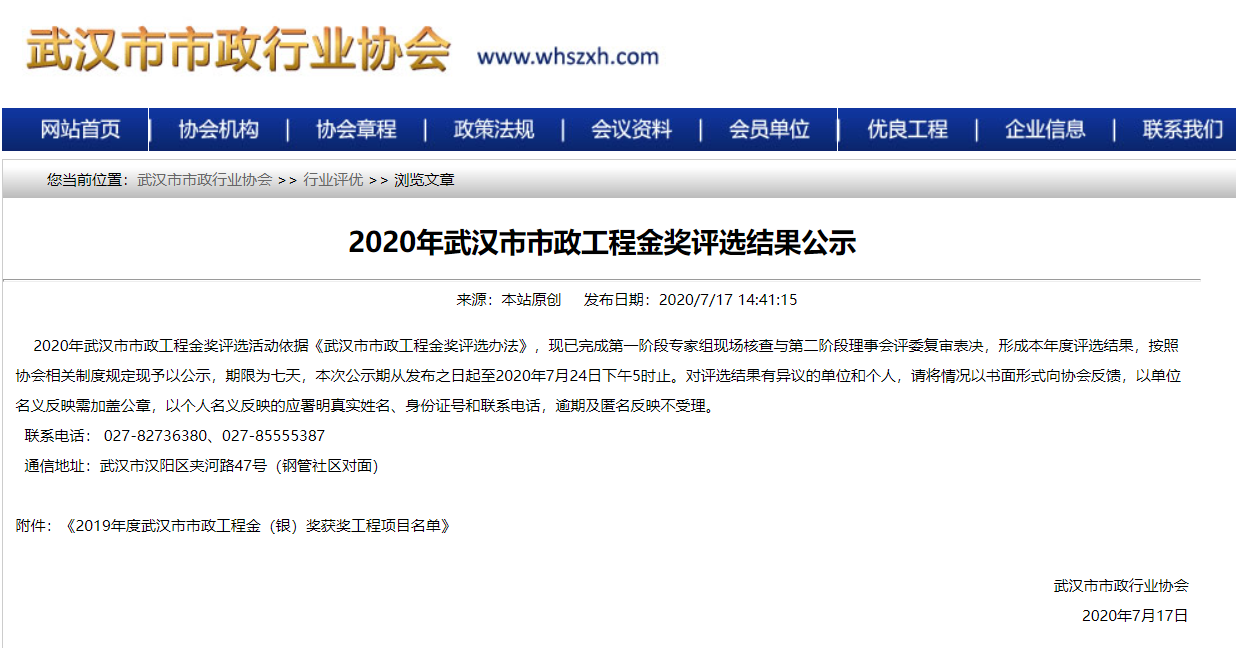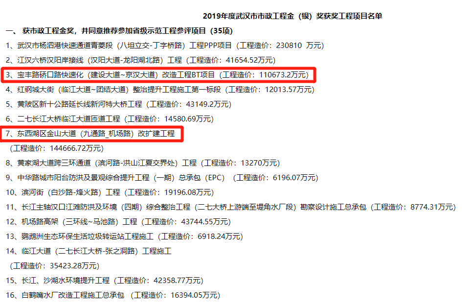 2019年武漢市市政工程金獎入選工程項目名單公示