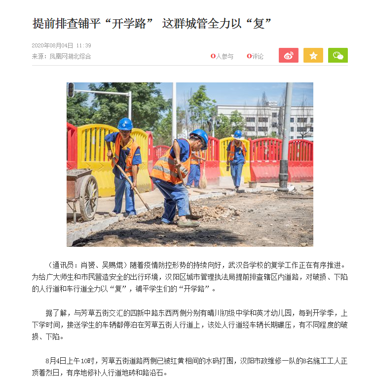 ? ? ? 近日,漢陽市政維修一隊負責(zé)的漢陽區(qū)內(nèi)日常道路維修工作,先后受到漢陽知音、鳳凰網(wǎng)湖北綜合、長江日報等主流媒體的一致好評。此前,漢陽市政維修一隊道路維修工作也曾多次獲媒體正面報道。