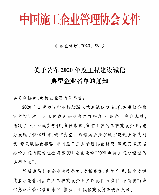 ? ? ? 2020年工程建設(shè)行業(yè)持續(xù)深入推進(jìn)誠(chéng)信建設(shè),廣泛開展行業(yè)信用評(píng)價(jià)工作。近日,中國(guó)施工管理協(xié)會(huì)公布了“2020年度第一批工程建設(shè)企業(yè)信用評(píng)價(jià)”和“2020年度工程建設(shè)誠(chéng)信典型企業(yè)”名單,漢陽(yáng)市政多個(gè)公司獲評(píng)榮譽(yù)。