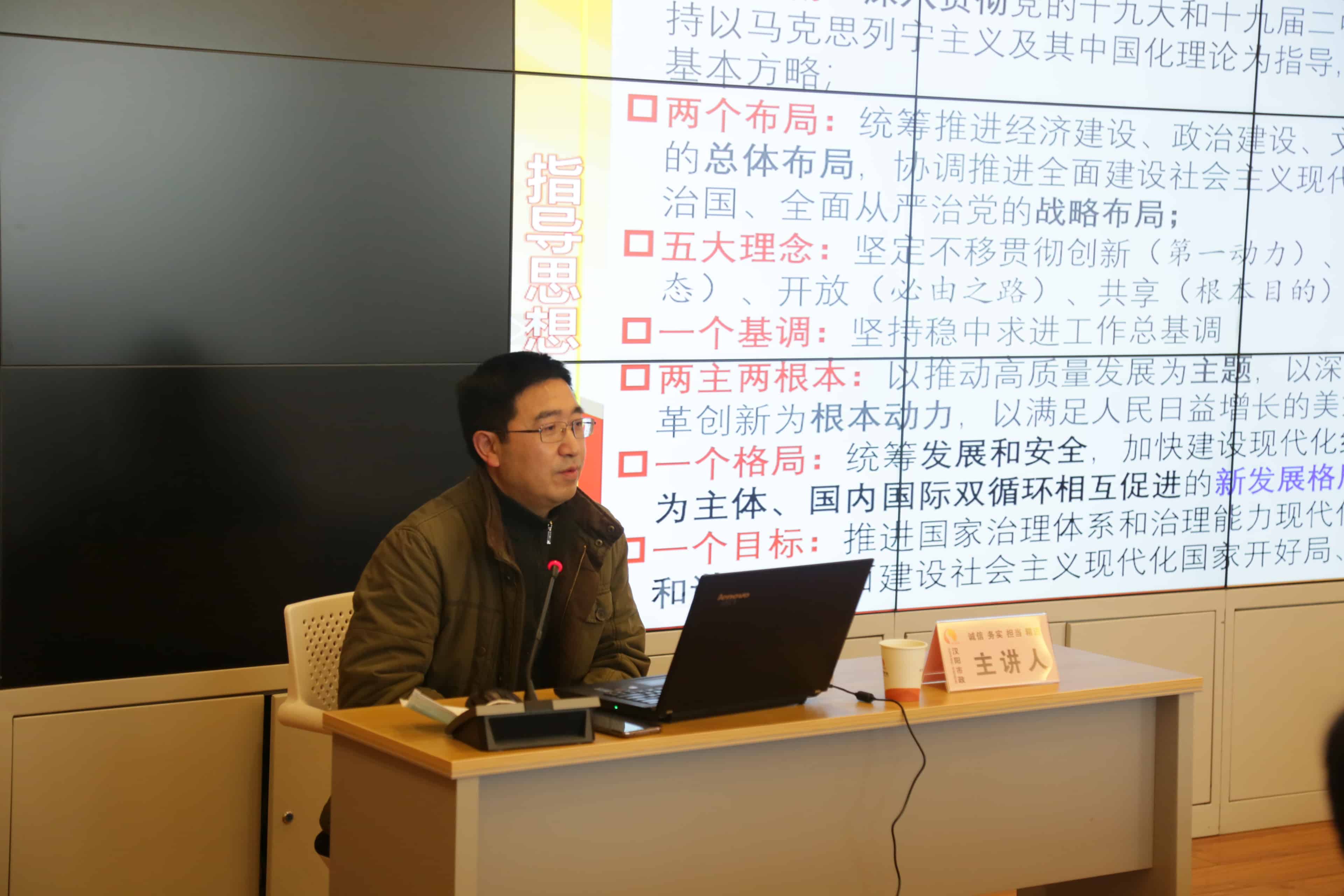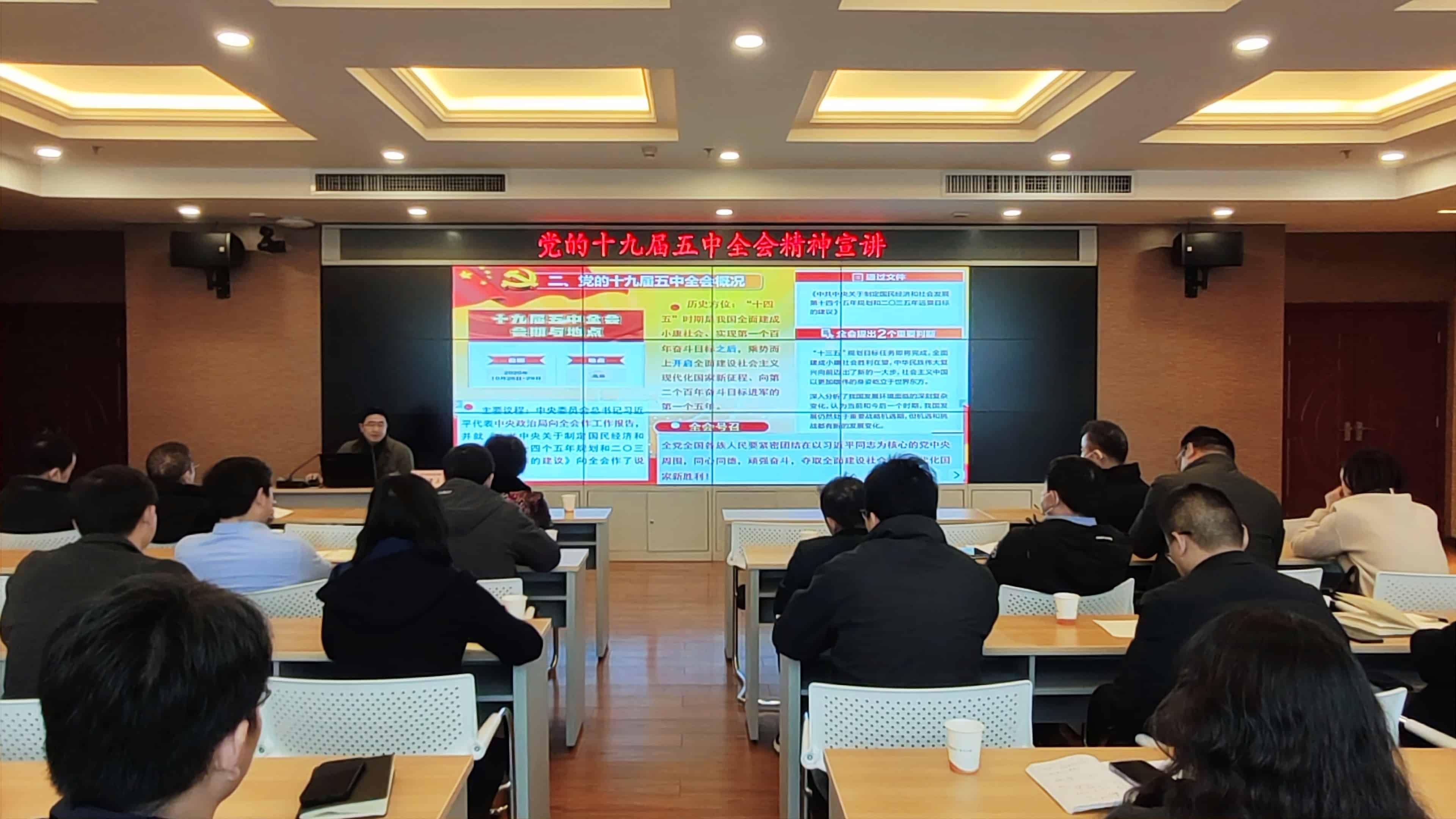 ? ? ? 12月26日上午,黨的十九屆五中全會精神宣講活動在集團18樓會議室舉行,宣講邀請了武漢市社科院政法所所長、市委宣講團成員田祚雄進行專題授課。漢陽市政黨委成員代表、各支部書記、副書記等相關(guān)人員參加了此次活動。