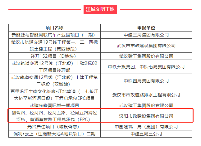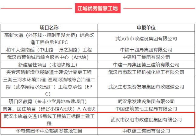 近日,由楚天都市報(bào)、武漢建筑業(yè)協(xié)會(huì)、武漢市建筑行業(yè)工會(huì)聯(lián)合會(huì)聯(lián)合主辦的2021年“創(chuàng)領(lǐng)智控杯”江城“雙十大”選樹結(jié)果揭曉,漢陽市政高新三路(三環(huán)線-外環(huán)線)改造提升工程總承包(EPC)獲評“江城十大智慧工地”,創(chuàng)智路、徑河路、徑河五路、徑河五路跨徑河橋、黃獅海東路工程總承包(EPC)獲評“江城文明工地”,武漢市軌道交通19號(hào)線工程第五標(biāo)段土建工程獲評“江城優(yōu)秀智慧工地”。