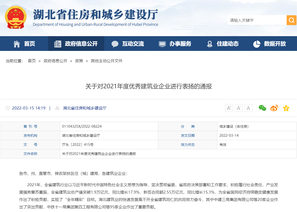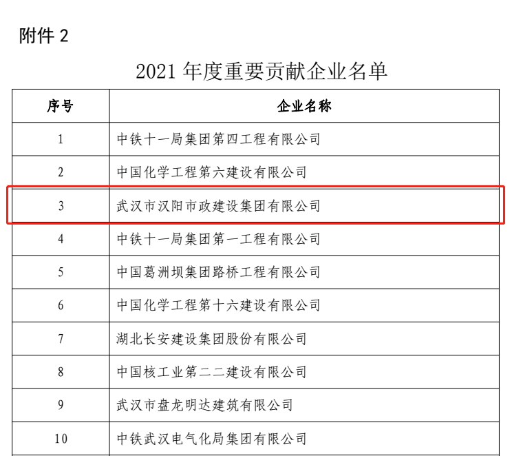 ? ? 3月15日,湖北省住建廳公布115家優(yōu)秀建筑業(yè)企業(yè)名單,揭曉2021年度突出貢獻(xiàn)企業(yè)和重要企業(yè)評(píng)選結(jié)果,漢陽市政獲評(píng)“2021年度重要貢獻(xiàn)企業(yè)”,獲通報(bào)表揚(yáng)。
