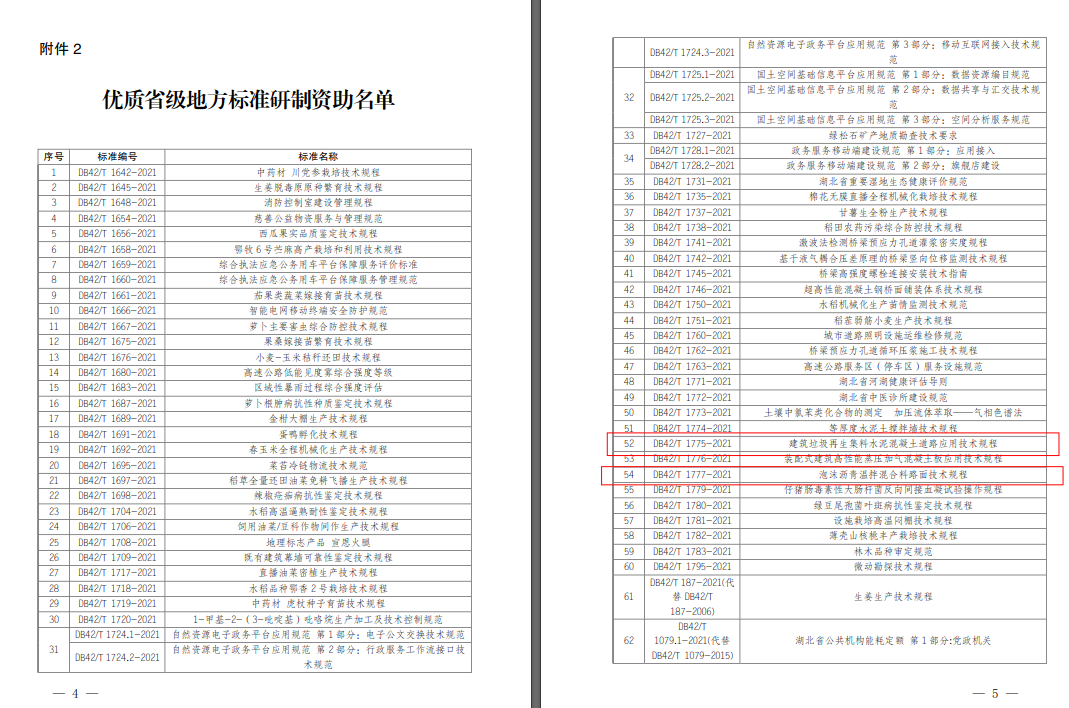 漢陽市政入選此次優(yōu)質(zhì)省地標為(《建筑垃圾再生集料水泥混凝土道路應用技術規(guī)程》DB42/T 1775-2021、《泡沫瀝青溫拌混合料路面技術規(guī)程》DB42/T 1777-2021),主要涉及混凝土和瀝青材料的推廣應用,標志著公司在垃圾資源化利用和泡沫瀝青的應用推廣等方面得到行業(yè)認可,達到省內(nèi)領先水平,具有較高的推廣應用價值,為將來在道路工程的新材料與綠色技術的研發(fā)和推廣提供有力支撐。