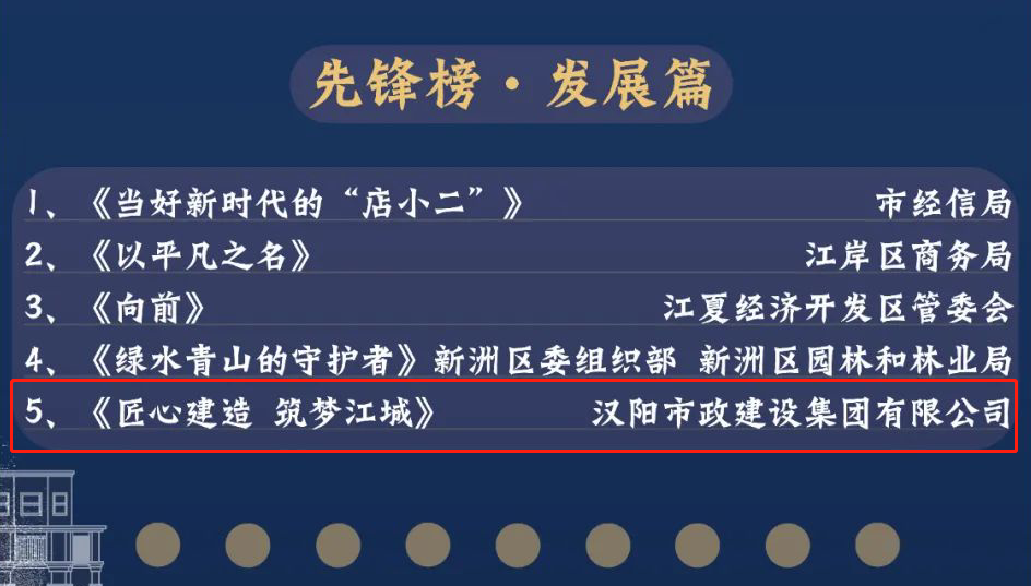 本次大賽共有565部作品參賽,經專家評審會三次雙月賽和年度賽評選,將制作水平較高,生動反映武漢市黨建引領基層治理創(chuàng)新實踐成果的30部作品,評為年度先鋒作品。漢陽市政黨委選送的作品《匠心建造 筑夢江城》榮列其中,該作品由博宏公司具體負責策劃攝制。