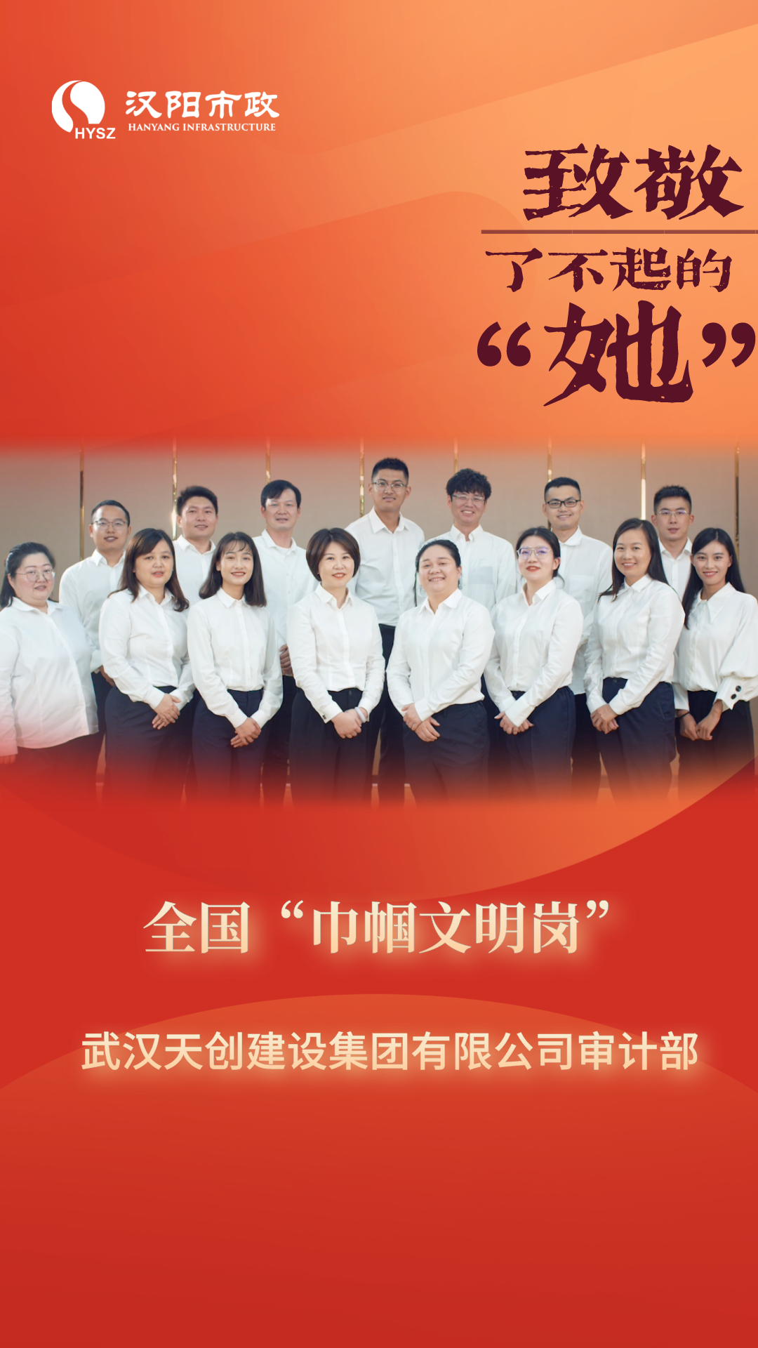 ? ? 近日,捷報頻傳!從全國婦聯(lián)、省婦聯(lián)、武漢市婦聯(lián)獲悉,漢陽市政天創(chuàng)建設(shè)公司審計部獲評“全國巾幗文明崗”榮譽稱號,漢陽市政集團工程部副部長羅惠敏獲評湖北省“巾幗建功標(biāo)兵”榮譽稱號,設(shè)計公司副總經(jīng)理韓梅獲評2022年度武漢市“新時代巾幗英雄”榮譽稱號!今天,讓我們一覽她們的巾幗風(fēng)采,“建”證她們的巾幗力量!