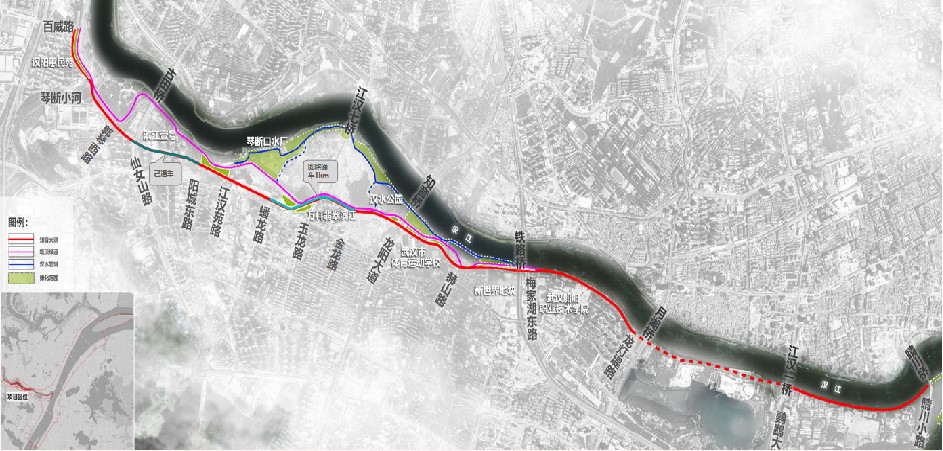 漢水碧道改造提升工程包含新建及提升琴斷口水廠上游至月湖橋段碧道,碧道總長(zhǎng)約5.77km,標(biāo)準(zhǔn)段寬4.5m,面積約3.27萬(wàn)㎡;修整漢江村民垸堤,重建堤頂?shù)缆烽L(zhǎng)約1.85km;在碧道沿線和琴韻碼頭等8個(gè)節(jié)點(diǎn)新建和提升綠化約23.59萬(wàn)㎡;提升晴川閣-琴川小路段1.53km碧道及綠化約1.74萬(wàn)㎡;新建漢水公園段護(hù)岸。同步建設(shè)驛哨、給排水、亮化、公共廣播及監(jiān)控等配套設(shè)施。