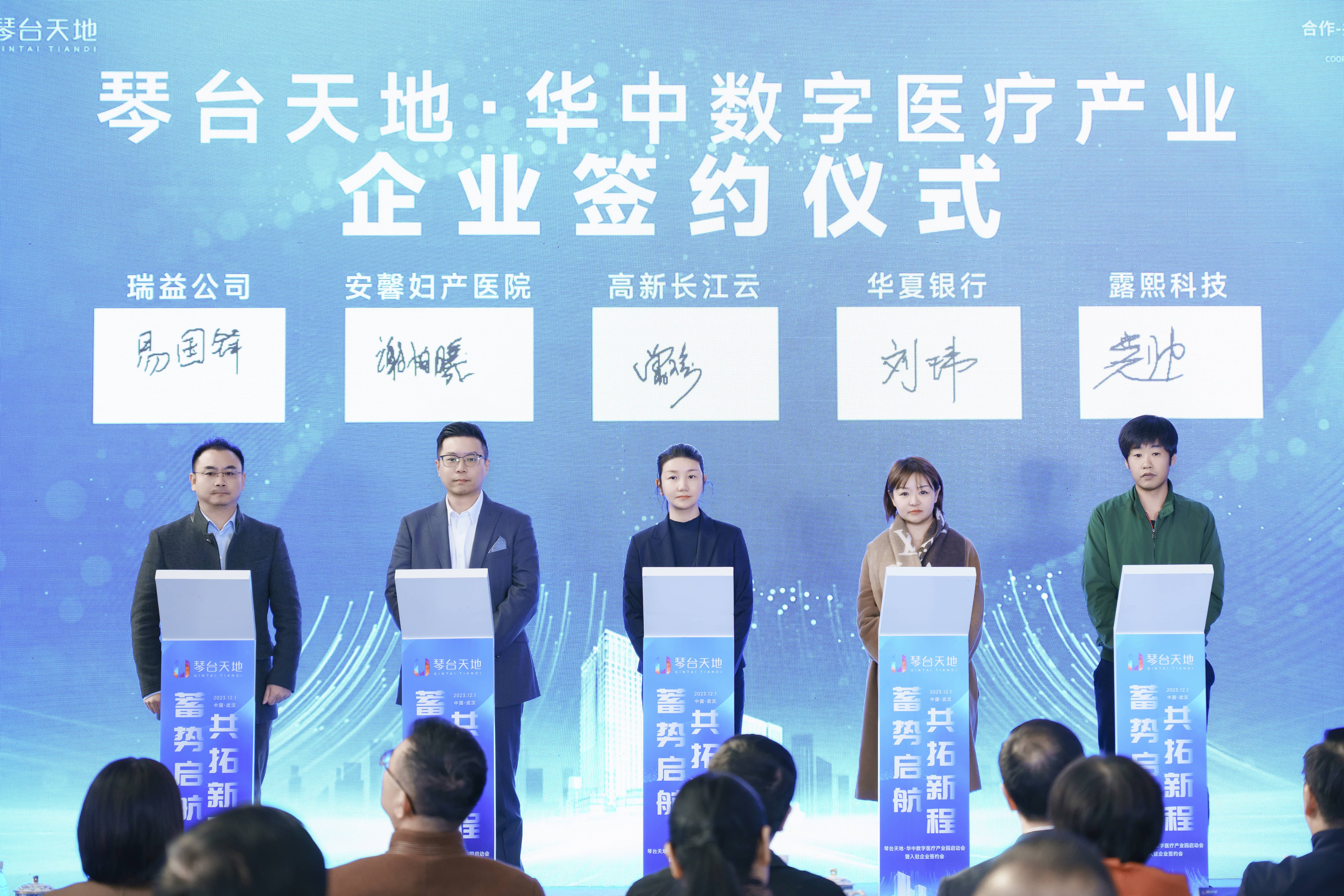 武漢安馨婦產(chǎn)醫(yī)院、武漢高新長江云科技有限公司、浙江露熙科技有限公司、華夏銀行漢陽支行與琴臺天地項目集體簽約