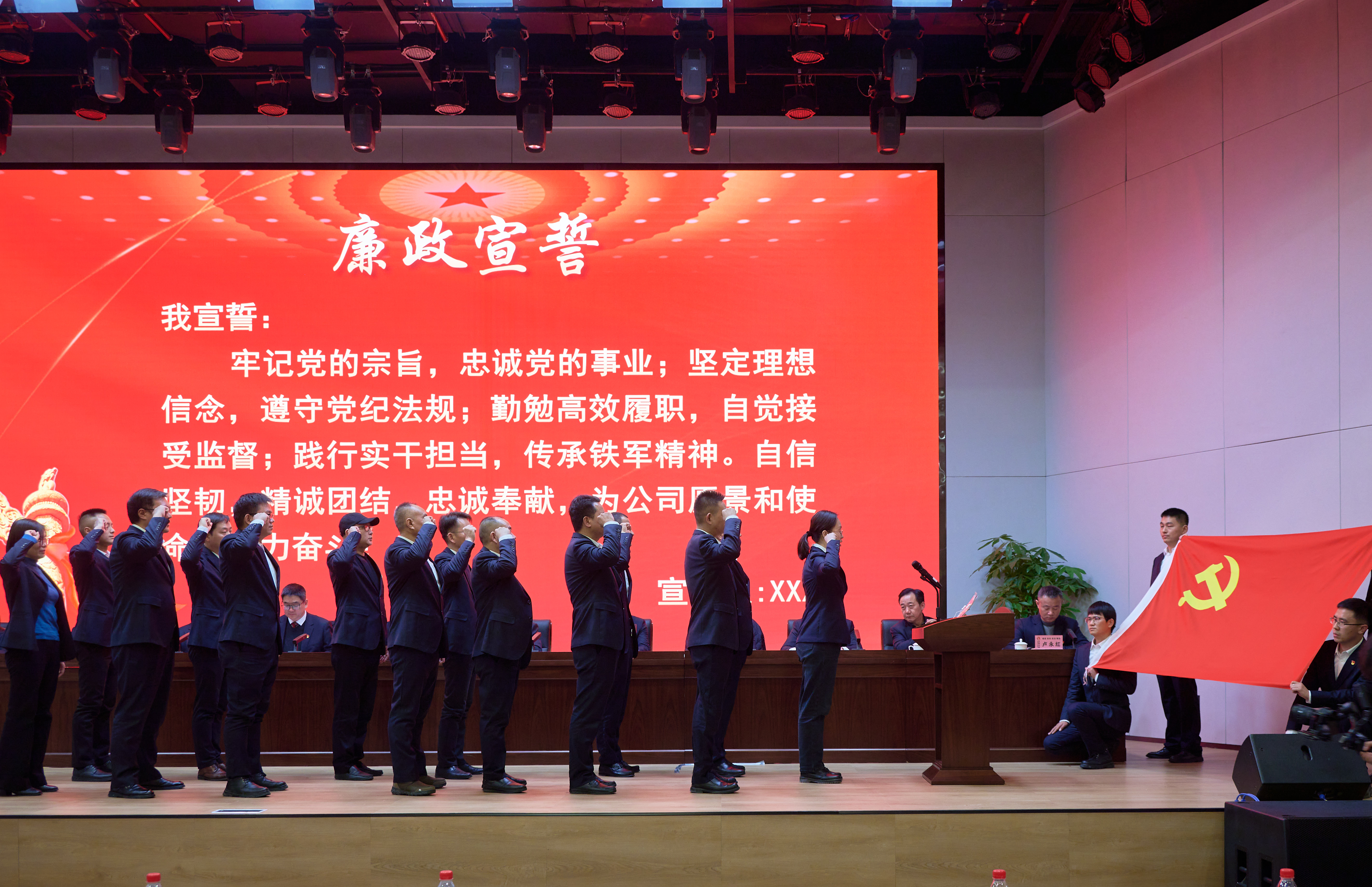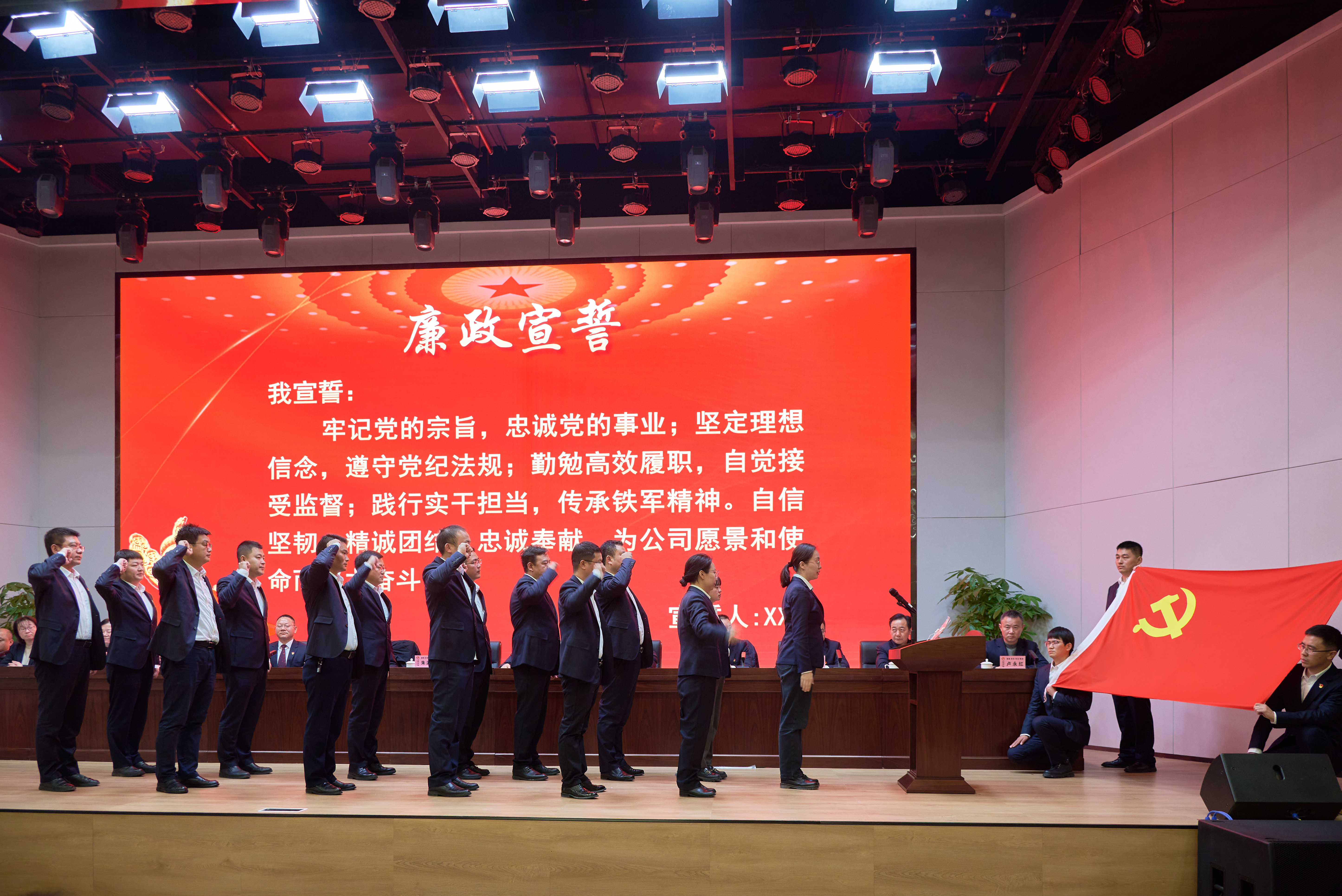 為進一步增強黨員干部履行“一崗雙責”的自覺性和主動性,基層黨組織負責人帶頭簽訂《黨風廉政建設承諾書》。隨后基層單位負責人及2024年崗位調整干部面向黨旗進行莊嚴的廉政宣誓。