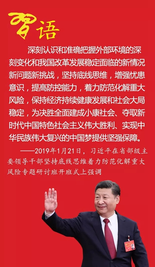 ——2019年1月21日,習(xí)近平在省部級(jí)主要領(lǐng)導(dǎo)干部堅(jiān)持底線(xiàn)思維著力防范化解重大風(fēng)險(xiǎn)專(zhuān)題研討班開(kāi)班式上強(qiáng)調(diào)