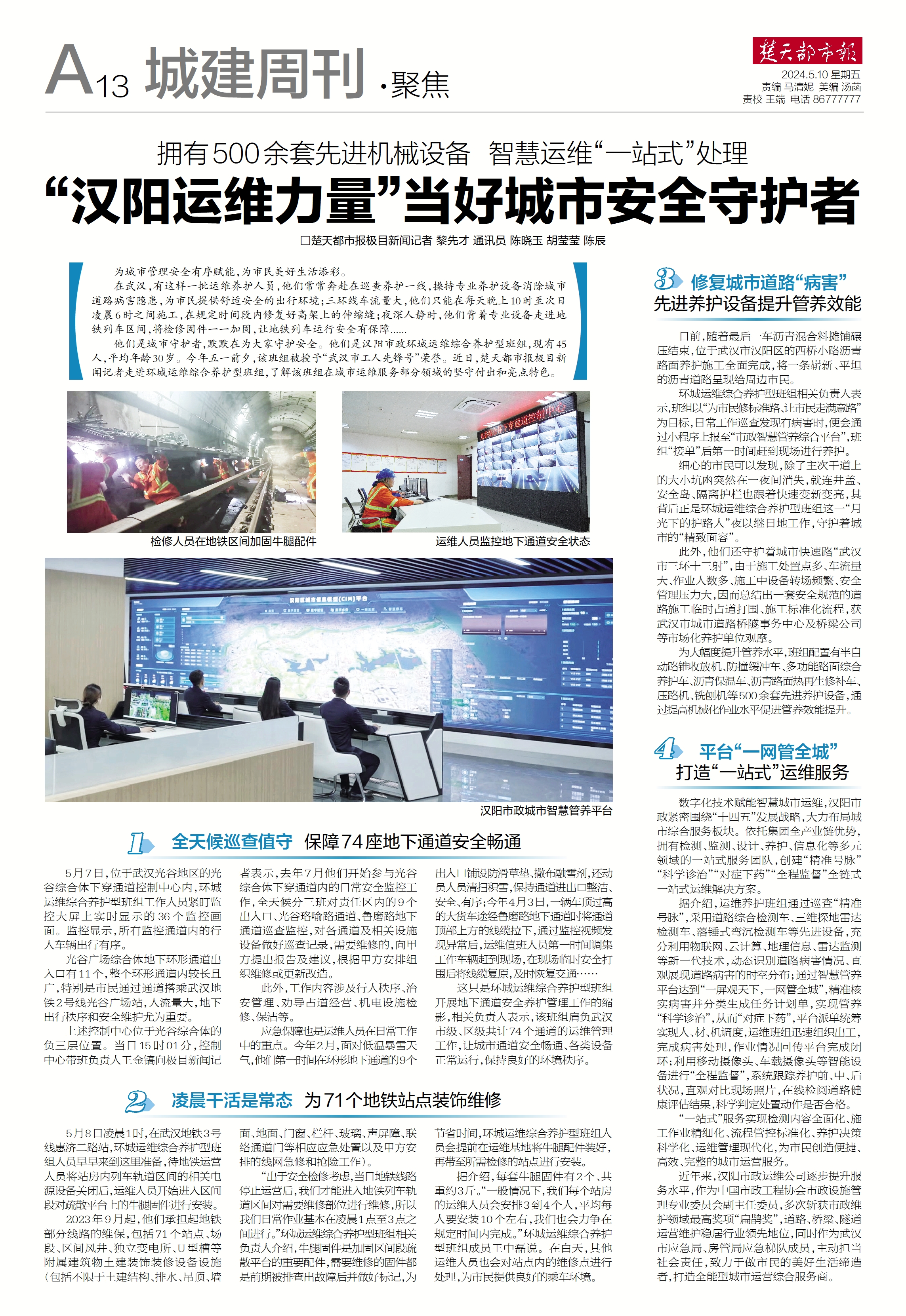 楚天都市報(bào)推出《擁有500余套先進(jìn)機(jī)械設(shè)備 智慧運(yùn)維“一站式”處理——“漢陽運(yùn)維力量”當(dāng)好城市安全守護(hù)者》專版報(bào)道。