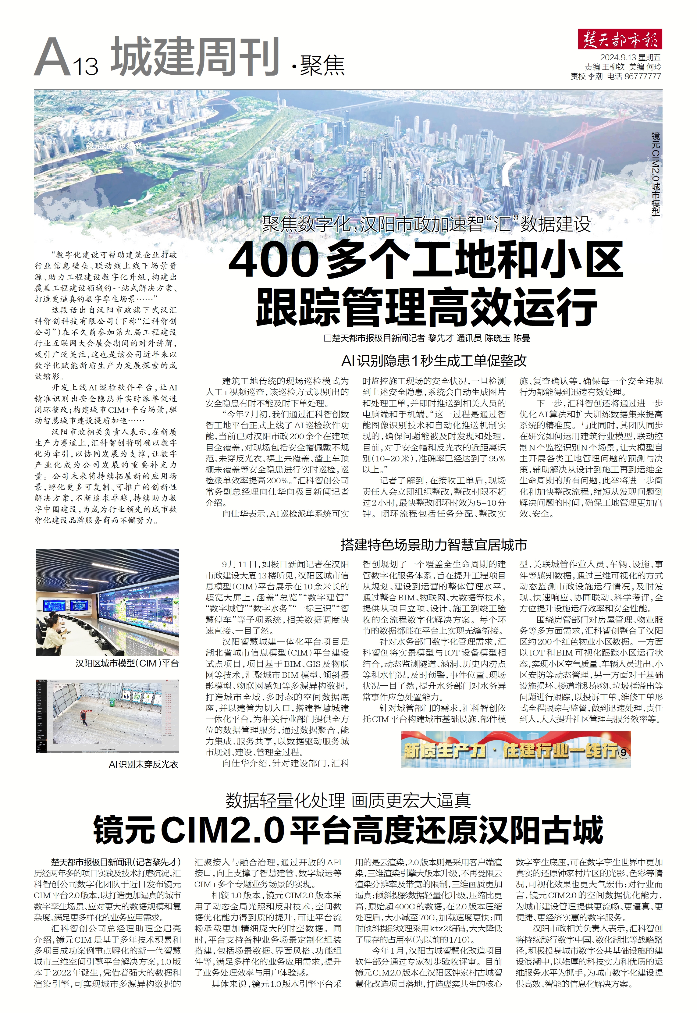 ? ? 楚天都市報(bào)推出《聚焦數(shù)字化,漢陽(yáng)市政加速智“匯”數(shù)據(jù)建設(shè),400多個(gè)工地和小區(qū)跟蹤管理高效運(yùn)行》專(zhuān)版報(bào)道。